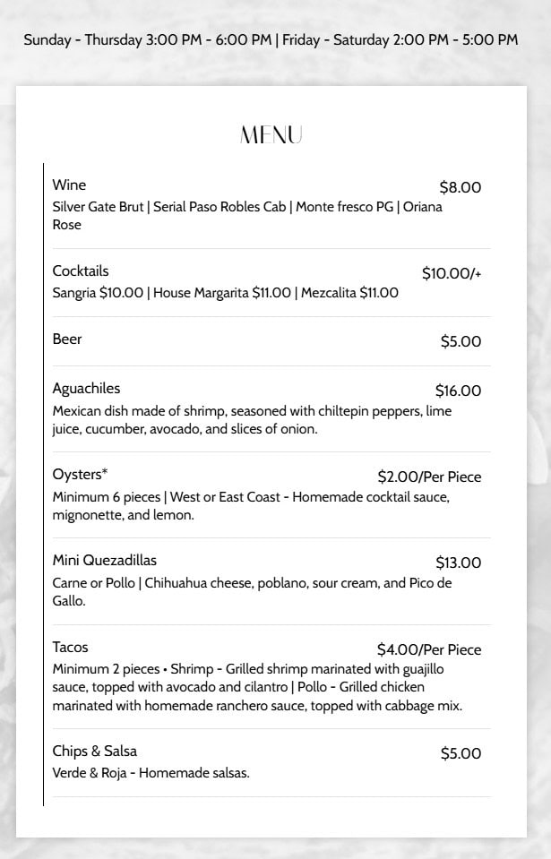 Using only the freshest ingredients and time-honored recipes, we invite you to embark on a culinary journey that captures the essence of Mexico's diverse regions and traditions.