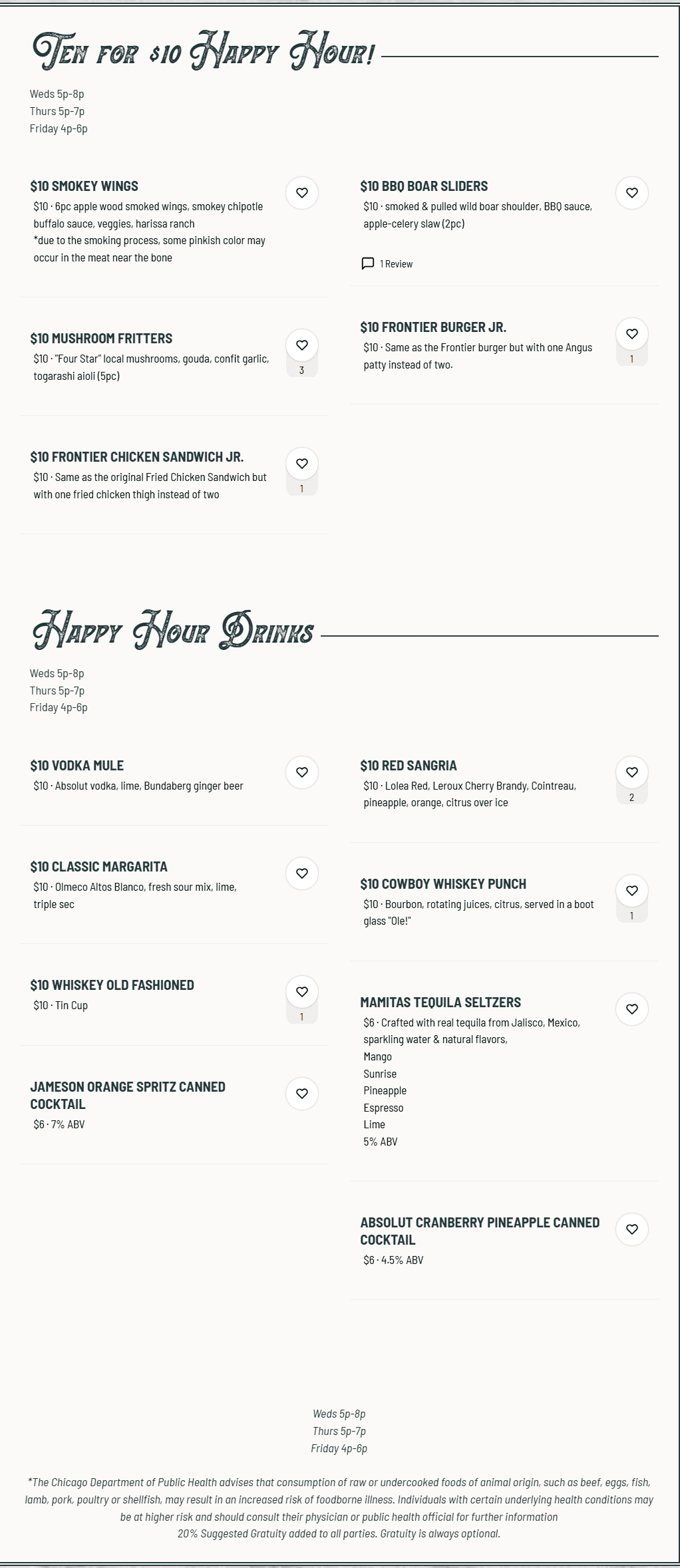 Located in West Town, Chicago, Frontier features wine pairings, specialty cocktails and taps with 16 seasonal and traditional beers including American-craft microbrews, complimentary to Frontier’s savory menu items. The bar is one of the few in Chicago to employ almost all state-of-the-art ice taps, which keep the beer colder and fresher while creating a cleaner pour. Along with an impressive lineup of libations, Frontier promises an unique dining experience. Executive Chef Brian Jupiter has created mouthwatering dishes celebrating American contemporary cuisine, blending game and other seasonal ingredients into classic and approachable fare. The seasonal dinner menu includes small plates, soups, salads, sandwiches and entrees designed to share. Frontier’s menu also features eight to 10 varieties of oysters as a signature offering to order a la carte with dinner or to enjoy with a bucket of beer at the bar. Over the weekend, patrons can indulge in a brunch offering including a wide-selection of Frontier signature dishes alongside traditional breakfast items.