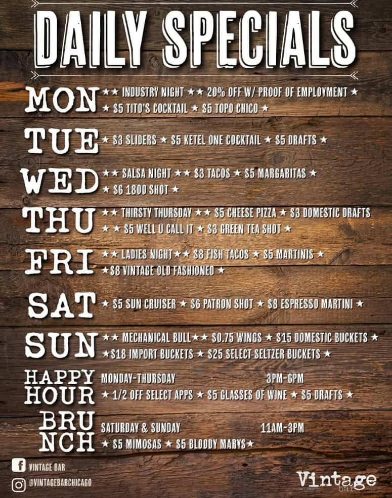 Vintage Bar provides customers with a casual Chicago bar experience including quality drinks and fan. Come enjoy our indoor/heated outdoor seating with cocktails and food!